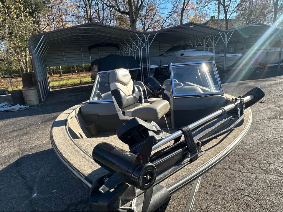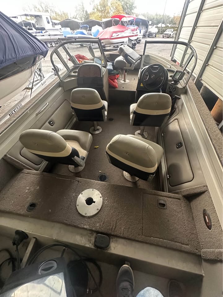 Great set up for a fishing boat. 60hp Mercury outboard. In 2024 the motor was tuned up, water pump impeller replaced, gear lube changed, new bilge pump, replaced the water pressure gauge and replaced the starting battery. The boat has 5 seats and a walk through windshield. All vinyl is great condition. Aerated bait well. Plenty of storage for rods and gear. Trolling motor with footpedal. Stereo. New cover. This boat had been well cared for. Aluminum hull.