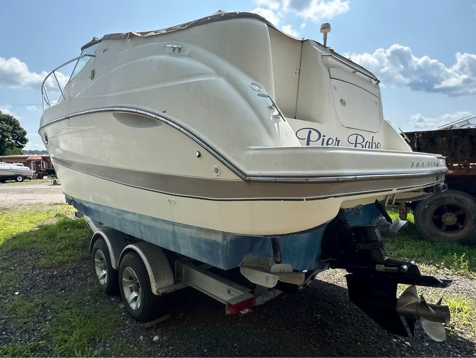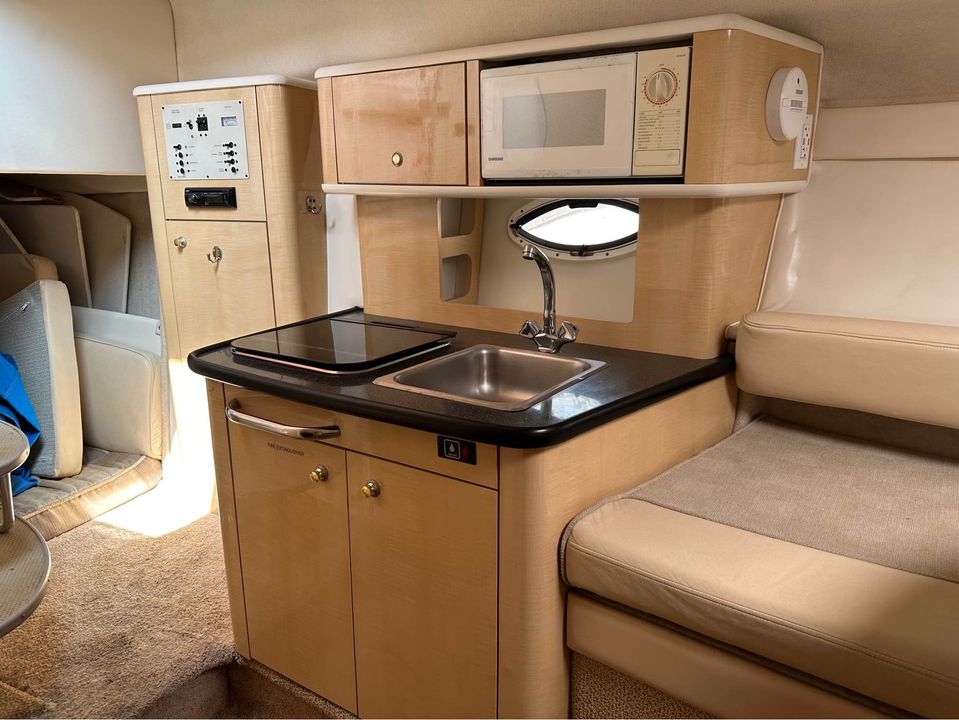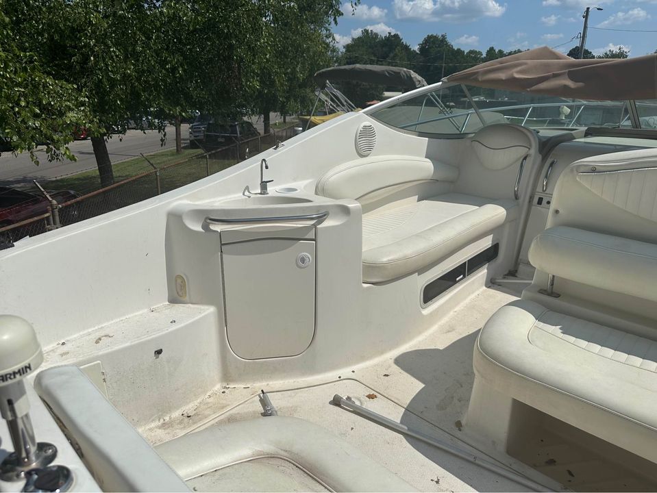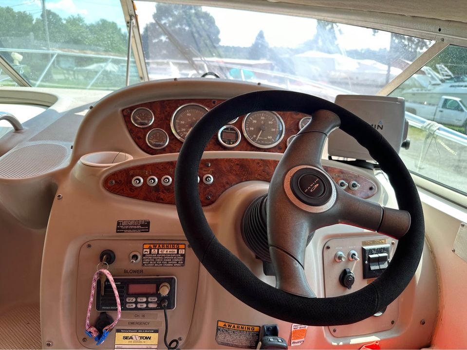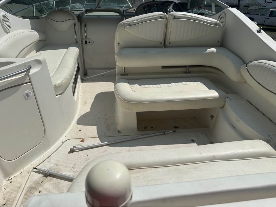Cruiser with aft cabin. Powered by 7.4L MPI Mercruiser with Bravo 3 outdrive. Only 285 hours. New marine A/C with reverse heat. This is 9ft 6in wide so it feels roomier than most 27 ft boats with 8ft 6in widths. Nice comfortable cockpit area. Cabin has an alcohol/electric stove, microwave and freshwater system. Bathroom has a head, sink and shower. Macerator. V Berth functions as a dining area and converts to a bed. Good sized aft cabin. Cockpit cover and full winter storage cover. No Bimini or camper tops.