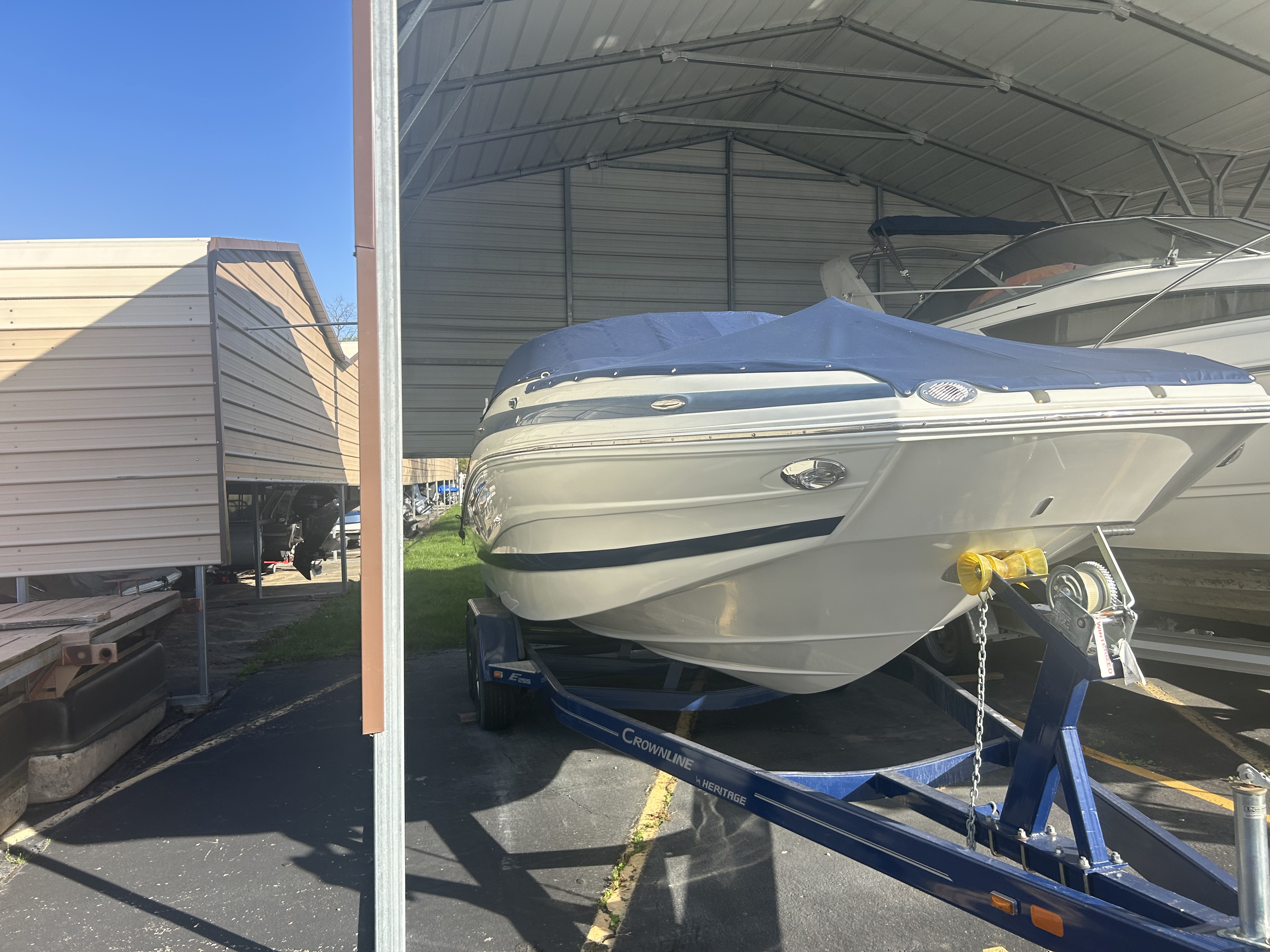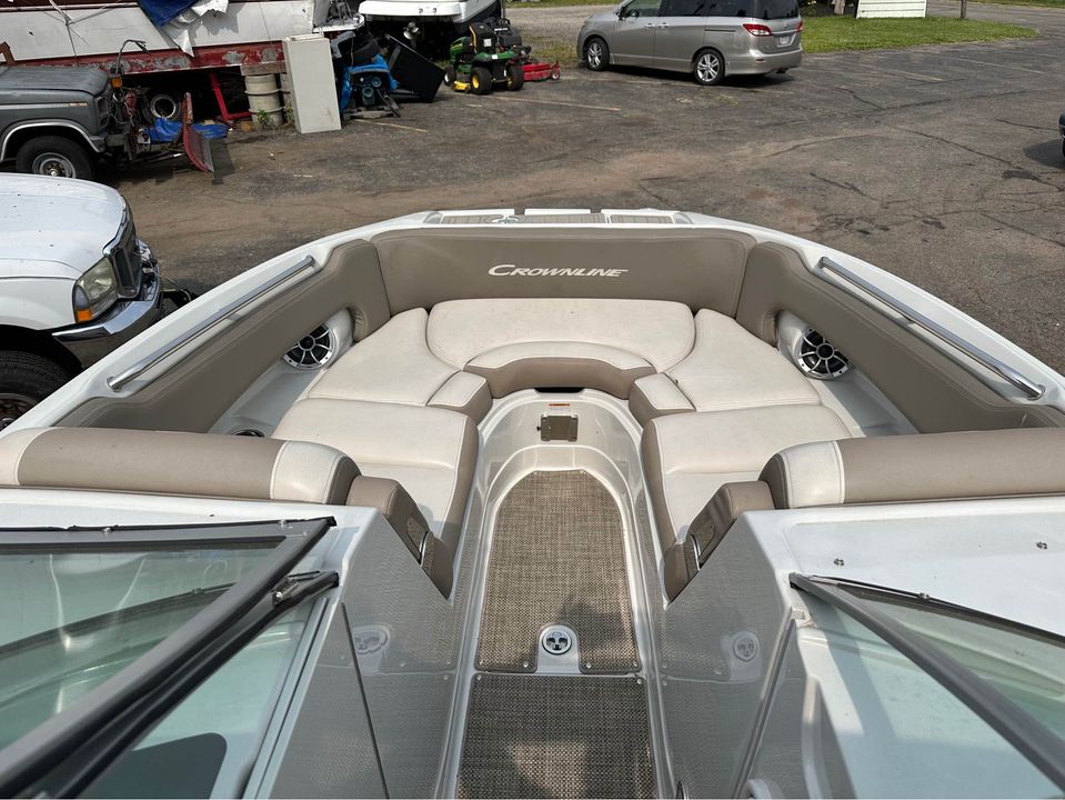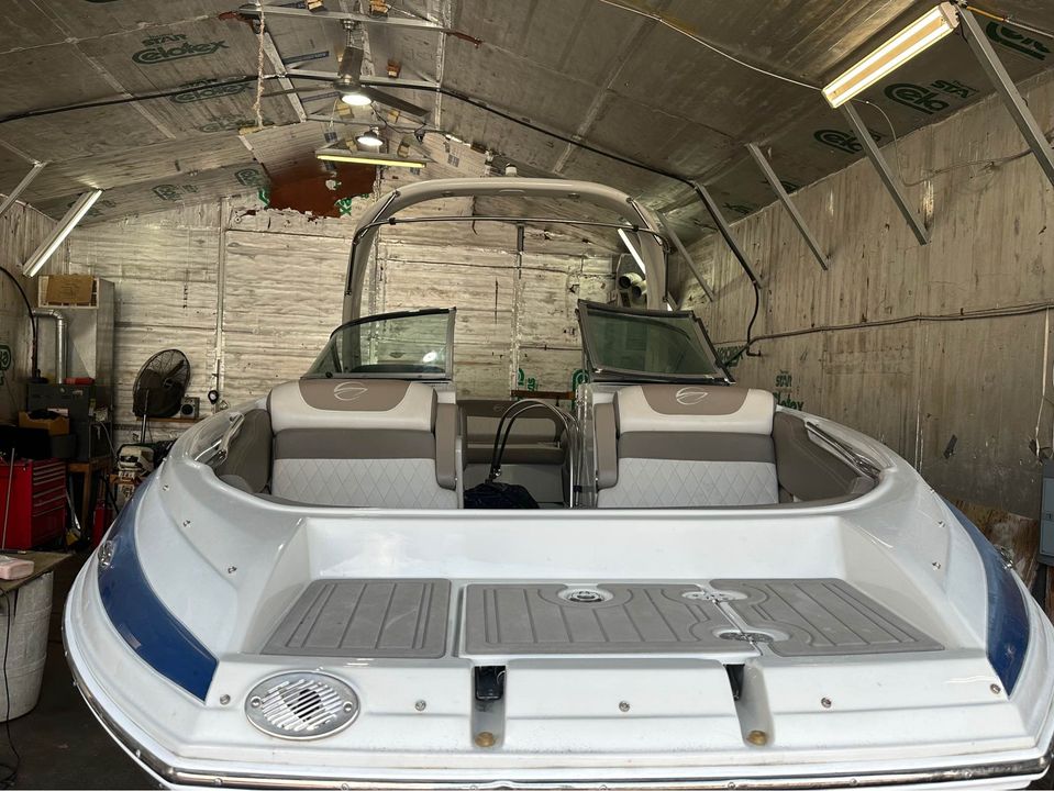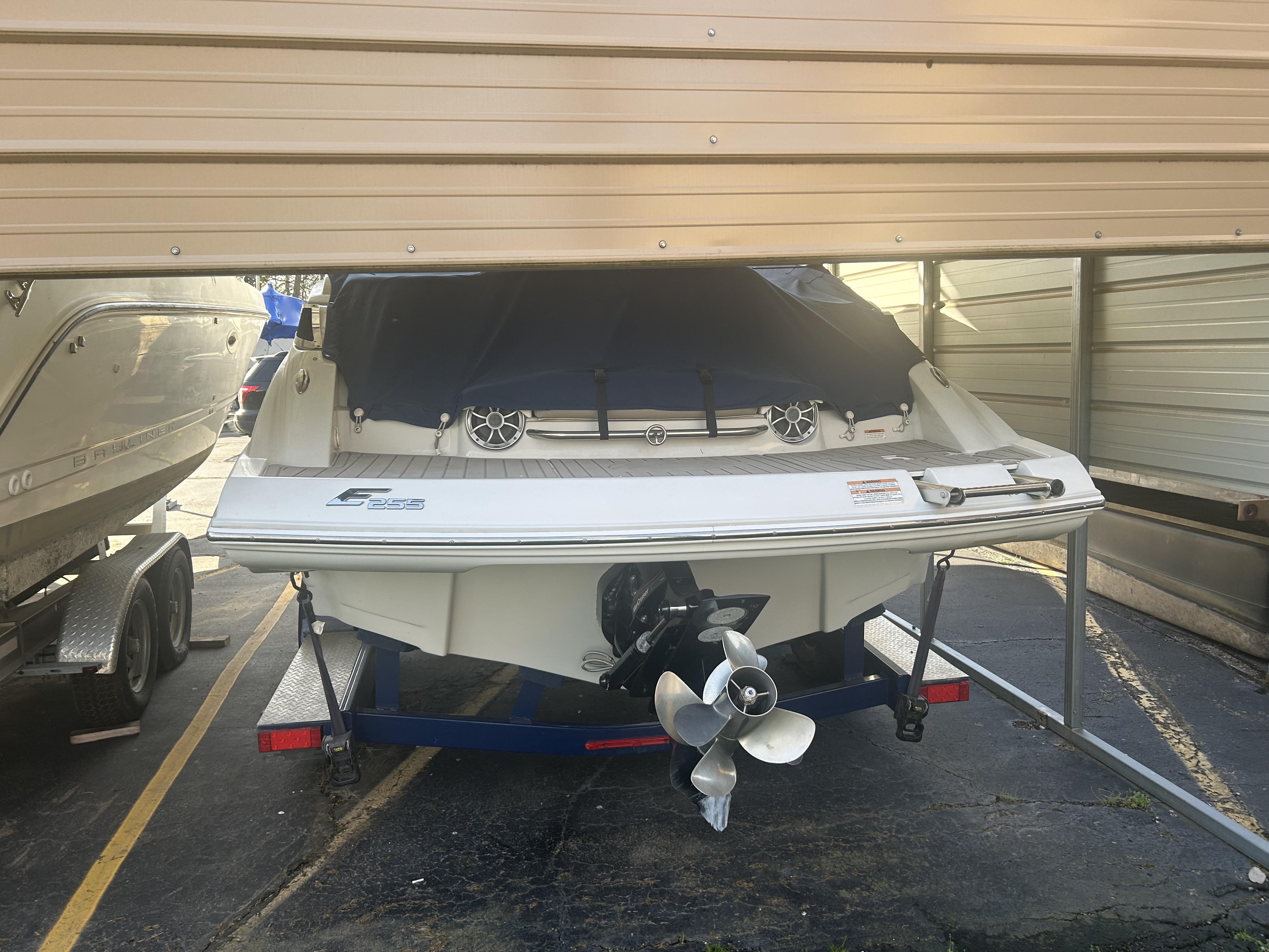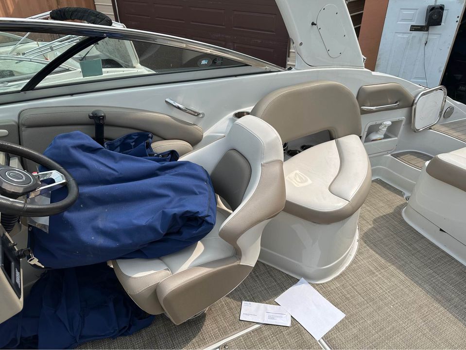 Luxurious 25 1/2 ft Deckboat loaded with options: 6.2L 300 hp Mercruiser with Bravo 3 outdrive, 421 hours, radar arch, woven vinyl carpet, SeaDeck carpet on swim platform and bow boarding area, step down bathroom with Vacuflush head and sink with granite counter, rear wash down, comfortable and relaxing seating, motorized transom seat back that holds position whether it’s in the sun pad or upright or anywhere in between. Front and rear boarding ladders, lots of storage, great sounding Bluetooth stereo with rear facing wet sounds speakers. Bimini top and bow and cockpit covers. Table that stows in a built in drawer in center storage area. Built in battery charger.